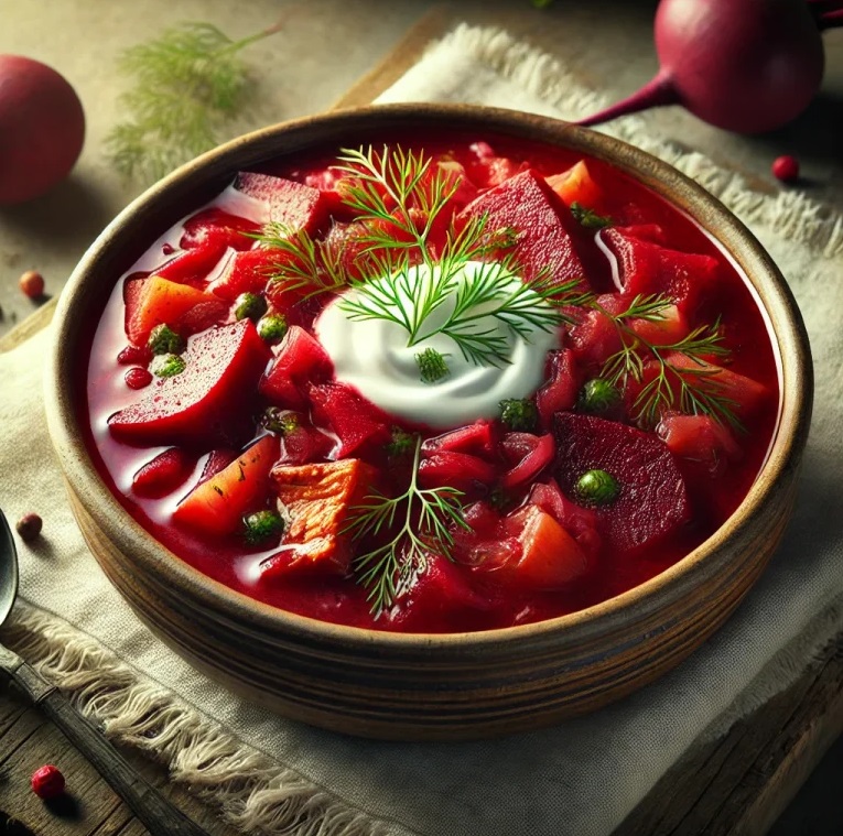 Ezután add hozzá a megpárolt céklás-zöldséges keveréket és a kockára vágott húst. Főzd további 10 percig. Ízesítsd sóval és zúzott fokhagymával. Hagyd pihenni 10 percet tálalás előtt.